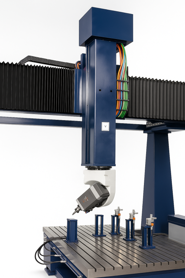 Prezentăm cu mândrie centrul de prelucrare KLASS HBR‑VTC MULTIPROCESS, un centru de prelucrare simultan pe 5 axe, cu axă rotativă suplimentară R, proiectat și construit integral în România. Cu curse mărite, arhitectură hibridă tip portal optimizată FEM și integrarea celor mai noi tehnologii Siemens Sinumerik, această mașină asigură rigiditate superioară, performanță dinamică excelentă și funcționare fiabilă 24/7 pentru aplicații industriale de mare anvergură în aluminiu, materiale compozite și rășinoase, fibră de carbon, fibră de sticlă și oțeluri aliate.
